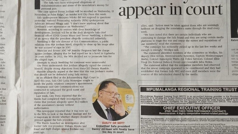 In a somewhat Kafkaesque turn of events, the Hawks have investigated Danny Jordaan, the President of SAFA. for R1.3 million fraud and theft for hiring a private security company for his personal protection, and a public relations company to defend him against rape claims, without authorisation from the SAFA board,” among other.