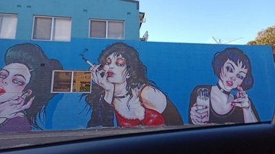 Karimbla Rd (Cnr Kiora Rd) in Miranda depicts a "street art" piece showing 3 young females who appear drunk, on drugs, beaten up and quite Hooker-ish in their appearance, all while drinking and smoking.