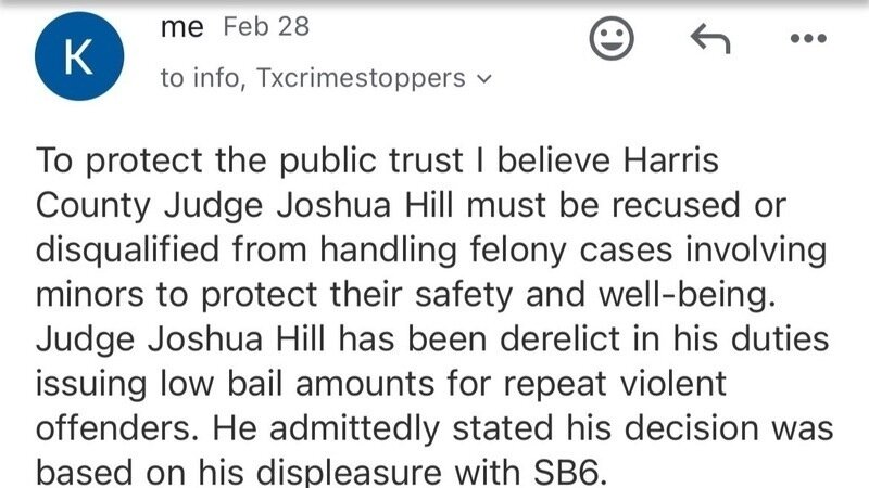 We have been busy trying to recruit support from larger organizations such as the Houston Police Union and the Texas Crime Stoppers. Above is an email submitted requesting assistance with disqualifying Houston Judge, Joshua Hill from overseeing any felony cases where the victim is a minor.