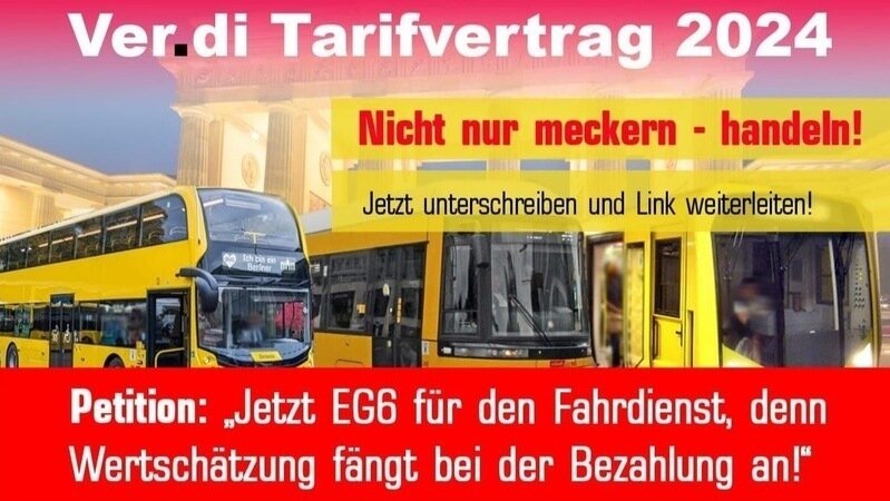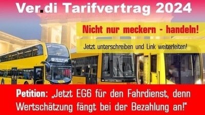Der von der Ver.di-Tarifkommission und dem BVG-Vorstand angestrebte Tarifabschluss 2024 stellt nach Meinung vieler Fahrer und der des Verfassers dieser Petition eine Herabwürdigung des Fahrdienstes dar.
