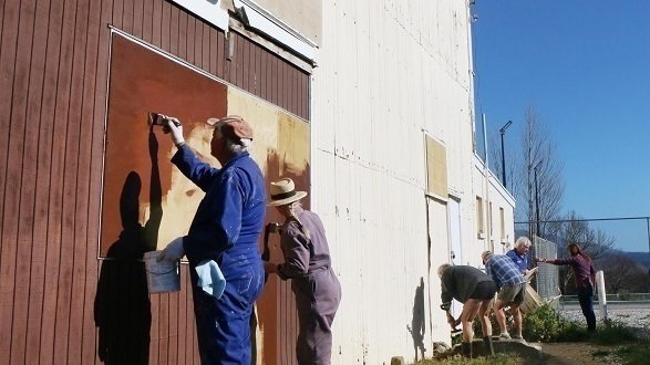 As the parties in the Grandstand story together work through the formal steps necessary to reopen the Grandstand for public use, a small team of volunteers from the Golden Bay Grandstand Community Trust and the Golden Bay Grandstand Restoration Society along with individual supporters met during the weekend (Sunday 26th August) to tidy up the exterior of the grandstand building and apply paint to wall patches.