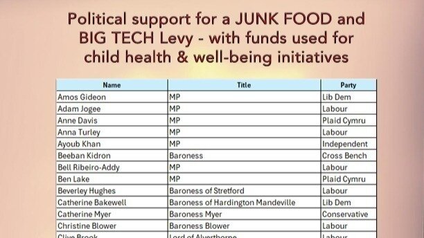 We now have 45 Politicians in support of OUR call for a levy on Junk Food and Big Tech, to fund child health & well-being.