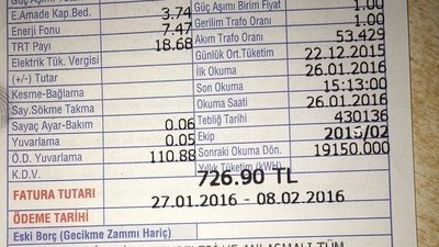 Ocak 2016 itibariyle gelen zamlar can yakıcı şekilde.İş yerime gelen fatura anormal derecede artmış.Zaten iş yok oturmuşuz tüm ay normalde 500 lira gelecek fatura 726 lira gelmiştir.Hadi zam gelmiştir eyvallah fakat bu faturada Yuvarlama hesabı ne şekilde yapılıyor bunu kimse takip etmiyormu 726 liralık faturamın yuvarlak hesabına nasıl 110 lira dahil edilebiliyor bu tamamen soygundur.