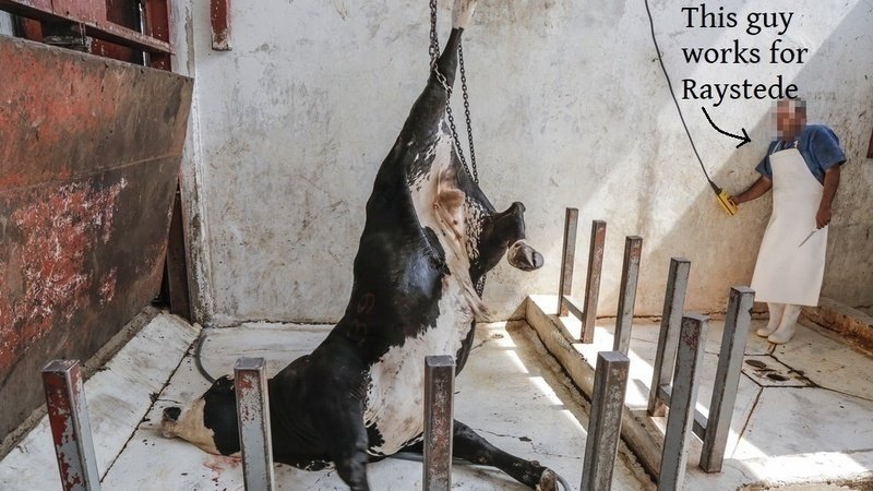 One of our supporters - let's call him Mr X - recently got a slapped wrist from Moonpig for sending an anonymous card that might cause distress. Mr X said that apparently one of the Raystede trustees had contacted Moonpig requesting, without success, the name of the sender of this card because it had the above photograph on the front. I agree, it is a very upsetting picture. I hesitated before posting it here. But then I realised that unless we force ourselves to look at these things we will never be able to stop them. We have to look. And we especially have to make the people who pay for it look. They only get angry because they know we're right and they don't want to face it. The following is what Mr-X wrote inside the card: "Consumers of meat and dairy are murderers by proxy. Those who encourage others to do it in the name of animal welfare are the worst of them. There is no need for animal protein in the human diet and therefore eating it is done only for pleasure. Animals suffer horrifically for the meat, fish, dairy and egg industries and since hurting animals for pleasure goes against everything Raystede stands for, it should not serve animal products in its cafe. Saving some animals does not give you a free pass to brutalize others. Raystede could be a leader in compassion, showing others the way and saving so many more animals. Honour your founder and do as she would have done - make the cafe vegan." As you can see, there is nothing threatening or abusive in that message, so the trustee's response to it is very telling. We have a response at last! We know we're getting somewhere. Keep writing, keep phoning, keep emailing - they do hear us. (see the last update for trustees' addresses or go to https://www.raystede.org/contact to contact the company directly) Thank you so much for your continued support, and don't forget if you want to contact me you can do so through the website https://makeraystedevegan.wordpress.com/