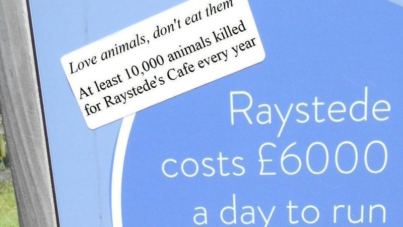 "Love animals, don't eat them. At least 10,000 animals killed for Raystede's cafe every year." (see the previous update - Numbers - for how we know that).