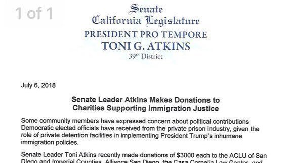 After facing increasing pressure from San Diegans opposed to the for-profit private prison industry, California State Senator Toni Atkins announced she has donated $12,000 to non-profit organizations supporting immigrants- an amount slightly more than the campaign contributions she had received.