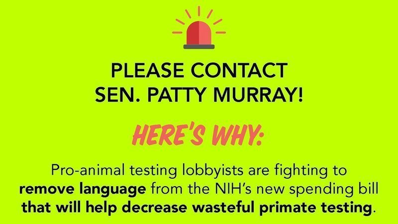 Whether you get a human or voicemail, politely tell them: "As Senator Murray's constituent, I urge her to support a measure in the 2020 NIH funding bill to provide more transparency about wasteful and cruel primate testing and efforts to reduce it. This language already passed the House, and I hope the Senator will support this commonsense effort because I have a right to know how NIH is spending my money."