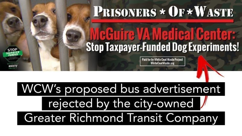 We’ve just won a federal lawsuit that says we have the right to place ads on city buses in Richmond, Virginia—in which we call out the Richmond VA for spending taxpayers’ money on wasteful and painful dog experiments.