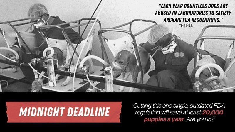 P.S. 11:59 PM DEADLINE: If 1,721more supporters rush just $16 tonight, we’ll hit our target. When you cut this one piece of FDA red tape, you’ll save 20,000+ puppies a year from max-pain torture. Isn’t that worth $16 bucks?