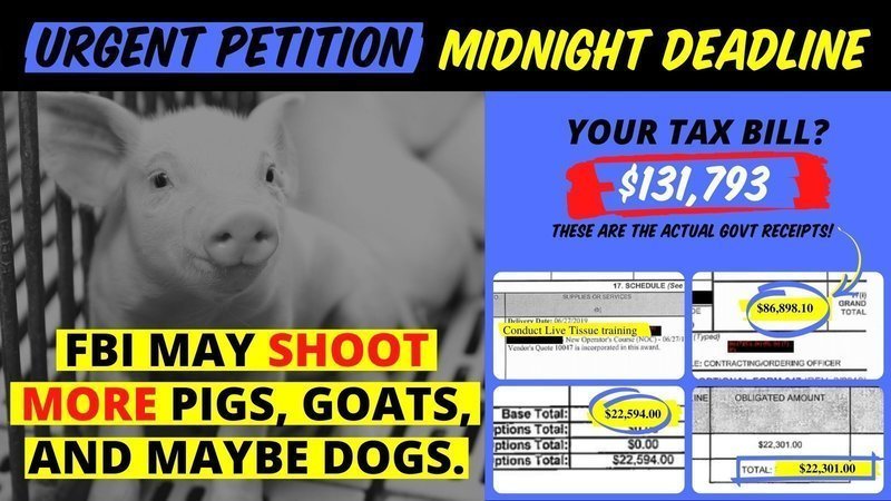 These receipts (pictured above) prove the DOJ sent $131,793 of YOUR TAX MONEY to the FBI and U.S. Marshals Service to purchase pigs, goats, and possibly dogs… then shoot, stab, dismember, and blow them up.