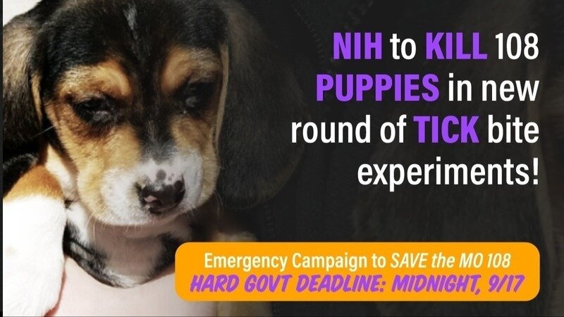 At 11:59pm on Sunday, 9/17: The National Institutes of Health (NIH) may ram through more taxpayer-funded dog abuse and kill 108 beagles at a Missouri laboratory.