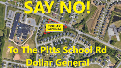 We believe that a Dollar General is not a good fit for our neighborhood. It is in very close proximity to an elementary school and the additional traffic is a safety concern for parents. Pitts School Rd is already overwhelmed with traffic. We are concerned what a dollar store will do to property value. We don't agree that a dollar store is necessary given the numerous grocery, pharmacy, and other dollar store options within a 5 mile radius. We don't agree that a commercially zoned site belongs on a stretch of road full of homes and two schools. Finally, we believe that as residents, we should have a say in what gets built in our own backyard.