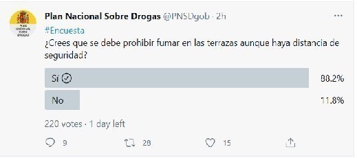 Mirad la encuesta que ha lanzado hoy el Ministerio de Sanidad en el Twitter del Plan Nacional de Drogas: "¿Crees que se debería prohibir fumar en las terrazas aunque haya distancia de seguridad?" De momento más del 80% de la gente ha votado SÍ.