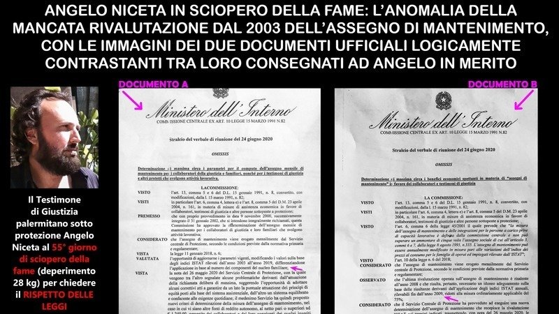 ANGELO NICETA AL 57° GIORNO DI SCIOPERO DELLA FAME (-29 KG) – UN TESTIMONE SOTTO PROTEZIONE INSIEME ALLA FAMIGLIA E L’ANOMALIA DELLA MANCATA RIVALUTAZIONE DAL 2003 DELL’ASSEGNO DI MANTENIMENTO, CON DUE DOCUMENTI UFFICIALI LOGICAMENTE CONTRASTANTI CONSEGNATI AD ANGELO AL RIGUARDO