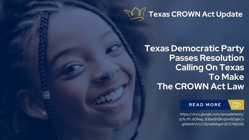 The Texas Democratic Party has passed a resolution at their state convention that calls on the Governor, all members of the Texas State Senate, and all members of the Texas House of Representatives to commit to suppor the Texas CROWN Act and pass it into law as soon as possible.