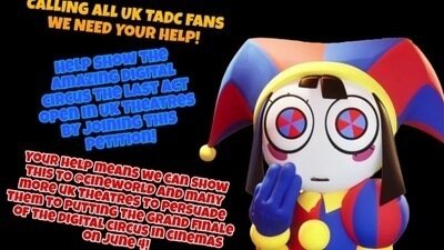 CALLING ALL UK TADC OOMFS, I HAVE GATHERED YOU HERE TODAY TO HELP SHOW The amazing digital circus the last act IN BRITISH CINEMAS! (cineworld for example) ONCE WE HAVE REACHED A HIGH GOAL I WILL SEND THIS TO CINEWORLD AND SHOW THEM WE WANT THE FINALE IN UK THEATRES! ID APPRECIATE IT IF YOU HELPED US REACH THIS GOAL SO WE CAN CONVINCE THEM TO CONTACT GLITCH AND FATHOM TO GET THIS SHOW ON THE ROAD 🫡🎪
