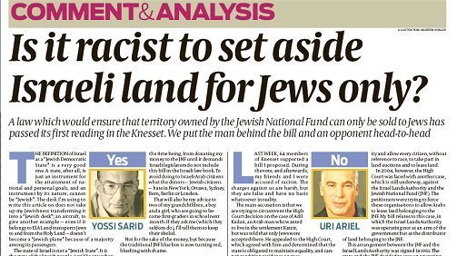 see below debate in Jewish Chronicle as to whether it is racist to refuse to sell land to non-Jews and ask yourself if it would be racist to refuse to sell land to Jews in Britain?
