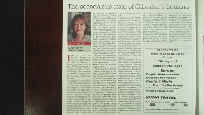 Jackie Anderson's excellent comment in the Gibraltar Chronicle 10th March 2020, highlights the need for an holistic housing plan for Gibraltar.