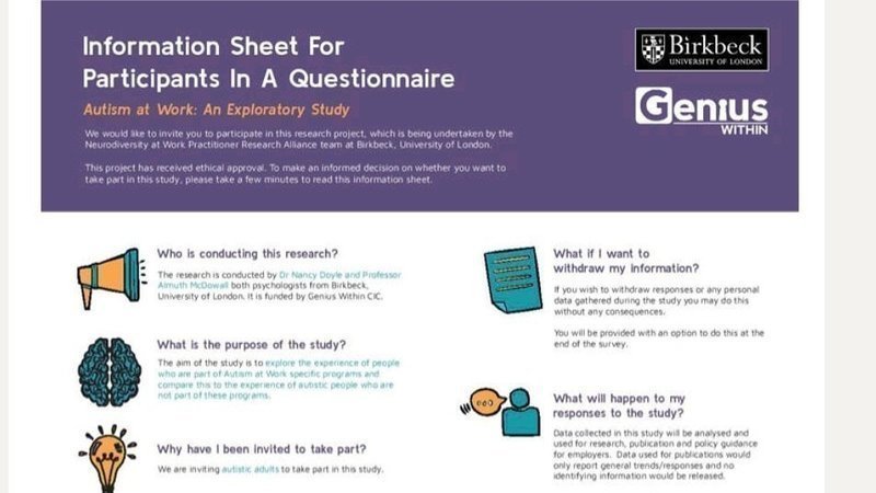 Nancy Doyle PhD is looking people who  autistic, who work or do not work so that she can compare these groups' experiences of inclusion and exclusion at work.