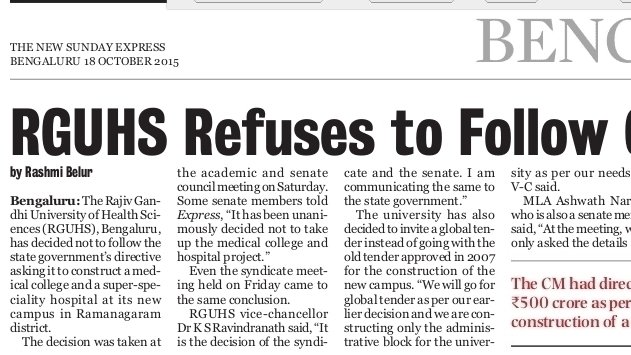 The Syndicate & the Senate of RGUHS have expressed their unwillingness to toe the Government line asking RGUHS to transfer the necessary amount for construction of the new campus from the university’s reserve. The supreme bodies of RGUHS feel that University needs only an administrative building and the medical college and hospital construction cost should be borne by the Government. More over when a University campus is being built it should be a world class structure with utility value hence the University wants to go in for a global tender for building the same whereas the GoK is sticking on to its demand of awarding the contract to the erstwhile construction company which was selected in 2007, but the terms of the contract and cost of project have changed drastically and is not in the spirit of the KTTP Act which is the bible for the Government while ordering and selecting the bidders from the tender process.