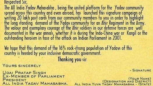 The All India Yadav Mahasabha , being the united platform for the Yadav community spread across all over the India & abroad, has launched a signature campaign of writing 20 lacs postcards from our community members to you in order to highlight the long standing demand of the Yadav community for an Ahir or Ahirwal Regiment in the Indian Army Please see attached the copy of the postcards being sent to your office. I Ved Yadav (President ,UK YADAV MAHASABHA ) along with all the members of our community in INDIA, UK, USA & all over the world,support this demand & start this petition to draw your attention to this matter, hoping for a quick decision. If the caste base Regiments are no longer possible in Indian Army in then this can be as region based Ahirwal Regiment.