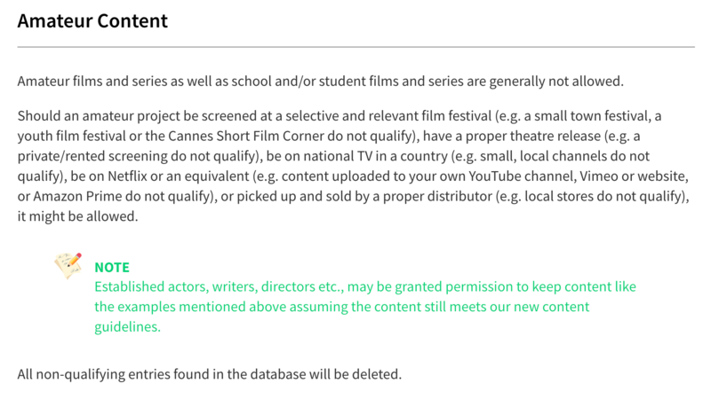 TMDB (The Movie Database) has recently updated it's terms and conditions to purposely exclude amateur films from being submitted to the website. Thats not right.