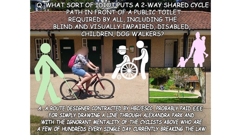 This shared cycle path is utterly ridiculous and we must send a firm message to HBC that cyclists need THEIR OWN ROUTE on an adjoining road, not through this narrow pedestrian park.