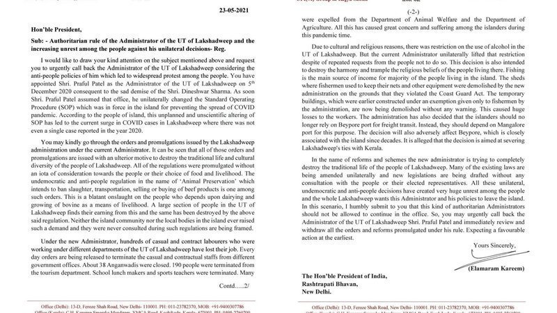 ln the name of reforms and schemes the new administrator is trying to completely destroy the traditional life of the people of Lakshadweep. Many of the existing laws are being amended unilaterally and new legislations are being drafted without any consultation with the people or their elected representatives. All these unilateral, undemocratic and anti-people decisions have created very huge unrest among the people and the whole Lakshadweep wants this Administrator and his policies to leave the island. In this scenario, l humbly submit to you that this kind of authoritarian Administrators should not be allowed to continue in the office. So, you may urgently call back the Administrator of the UT of Lakshadweep Shri. Praful Patel and immediately review and withdraw all the orders and reforms promulgated under his rule. Expecting a favourable action at the earliest.