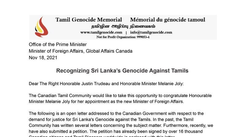The following is an open letter addressed to the Canadian Government with respect to the demand for justice for Sri Lanka's Genocide against the Tamils. In the past, the Tamil Community has written several letters concerning the subject matter. Furthermore, recently, we have also submitted this petition with 6000 signatures on February 17, 2021. The petition has already been signed by over 16 thousand Canadian citizens and Tamil Diaspora worldwide is enclosed with this letter.