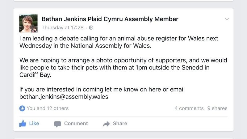 Beth's will be leading a debate calling for an animal abuse register for Wales next Wednesday in the National Assembly for Wales.