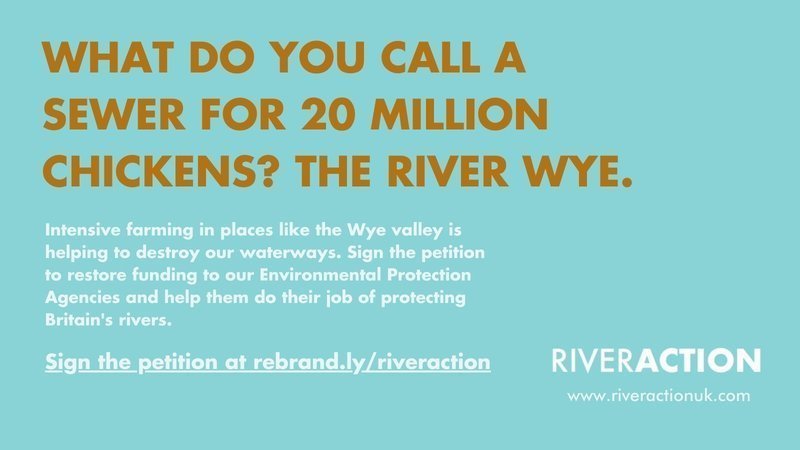 Phosphate levels have doubled in the past six years alone creating a wildlife death-trap. The primary cause of this is now widely accepted to be the nutrient-rich run-off of chicken excrement from intensive poultry units. The region is home to no fewer than 20 million chickens and their excrement, high in phosphate, is allowed to run freely into the Wye and its tributaries. Shockingly, the largest egg producer in the region, Noble Foods – owner of egg brand Happy Egg – entirely omits river pollution from its sustainability plan.