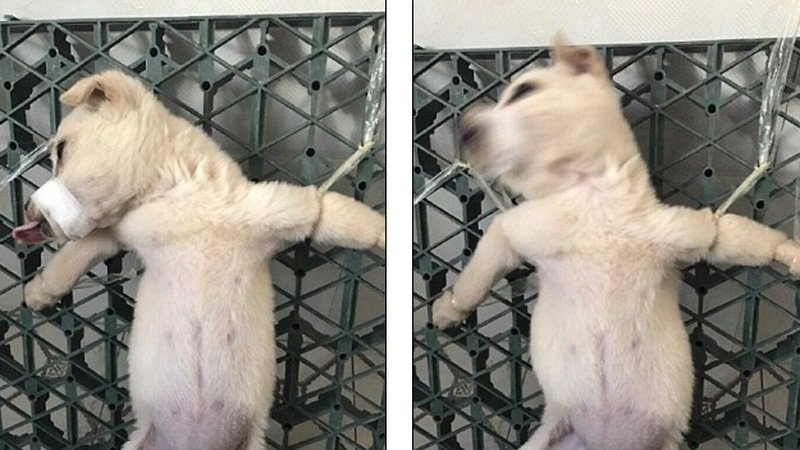Shown on the picture: With the intention to take revenge on animal welfare activists a Chinese man got hold of a puppy, tied him and started vivisection, that is he slashed the dog open, who was fully conscious. The brute's followers could watch this act of animal torture live on the internet. This is the video: http://www.akt-mitweltethik.de/images/aktuelles/2017/puppy_vivisection.mp4