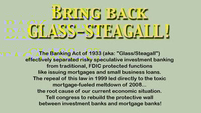 The Banking Act of 1933 (aka: "Glass/Steagall") effectively separated risky speculative investment banking from more traditional, FDIC protected functions such as issuing mortgages and small business loans. The repeal of this law in 1999 led directly to the toxic mortgage-fueled meltdown of 2008... the root cause of our current economic situation. Tell Congress to rebuild the protective wall between investment banks and mortgage banks!