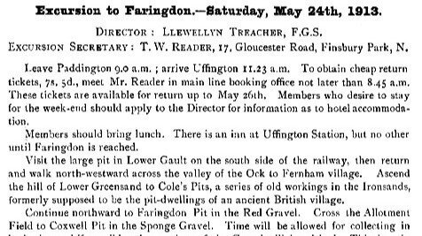 Both pits were once important destinations for fascinated members of the public and amateur geologists. In 1913 an ‘Excursion to Faringdon’ describes plans for a trip to Wicklesham and Coxwell Pits, starting from Paddington Station (see illustration). Members are advised to ‘bring lunch’ in preparation for a day of collecting the ‘beautifully preserved’ fossils of Wicklesham and Coxwell Pits, followed by a visit to Cole’s Pits and a ‘meat tea’ costing ‘1/6d’ at the White Hart, Faringdon. Members are advised there are ‘several views worth photographing, especially of the White Horse Hill’.