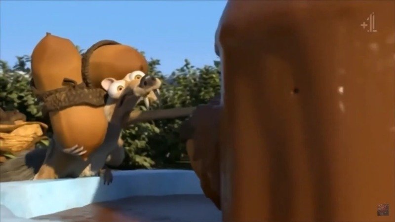 Scrat is thinking about coating acorns in chocolate for himself, Scratte and Baby Scrat.