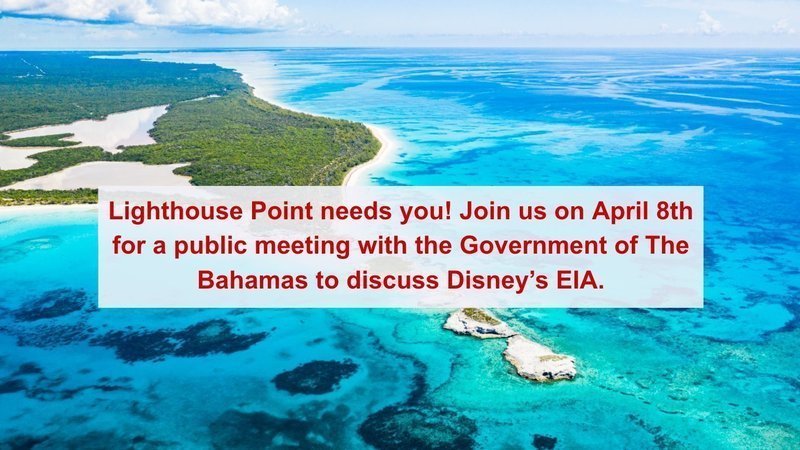 Tomorrow, April 8th, at 6:00 PM EST (Meeting ID: 979 4656 3786), the Government of The Bahamas is holding a public Zoom meeting to discuss Disney’s Environmental Impact Assessment for Lighthouse Point.