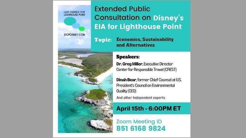 Please join us for our first extended public consultation on the adequacy of Disney’s EIA for Lighthouse Point on Thursday, April 15th at 6:00 PM EDT (Zoom link: https://us02web.zoom.us/j/85161689824 Meeting ID: 851 6168 9824).