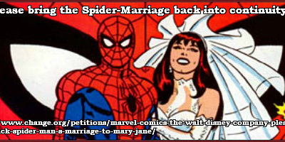 Since the conclusion of "One More Day" in December 2007, the Spider-Man comics haven't been the same. Marvel Comics had retconned the marriage of Peter (Spider-Man) Parker and Mary Jane Watson-Parker from existence by a deal with Mephisto in order to save the life of Peter's aunt May Parker. Since then, Marvel had explained what really happened on Peter's wedding day in the controversial "One Moment in Time" four-part story and Peter has been single and dating other women since "One More Day" took place, such as Carlier Cooper. To this day, the retcon of the Spider-Marriage is a very sensitive subject to fans of the Spider-Man comics and there are plenty of fans who dislike what has happened to Spider-Man from "Brand New Day" onwards. We are the fans who do not want Peter to remain single and we want the status quo to be as it was before "One More Day" took place, with Peter and Mary Jane married again. Please restore Spider-Man's marriage to Mary Jane Watson back into continuity, permanently. Thank you for your time.