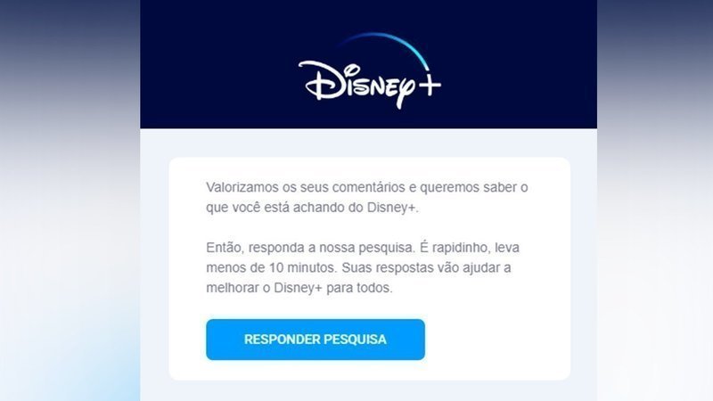 Recebi este e-mail agora a tarde do Disney+ e já respondi o questionário. É sobre o aplicativo, seus conteúdos, atendimento, o que deve ser adicionado mais pra frente. Algumas questões são de alternativas e outras abertas.