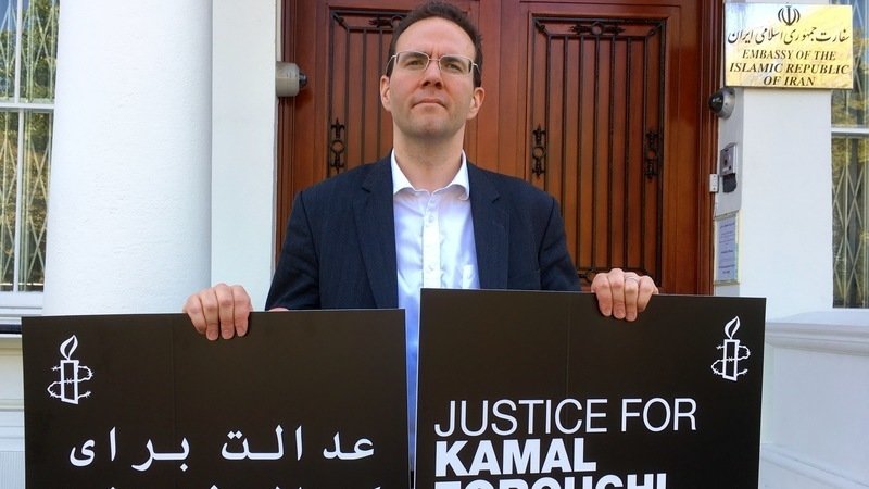 Unfortunately the 5 year anniversary of Grandpa Kamal’s Evin Prison detention came and went yesterday Thursday with no release. In the build up to the anniversary we received hints that he might be released on the day (I suspect they made this up to try to disrupt our protest and petition hand in at the Iranian embassy in London) but of course he wasn’t. The protest was very touching with family, friends and Amnesty team coming together. I attach a photo. (There are more photos on www.twitter.com/FreeKForoughi.)