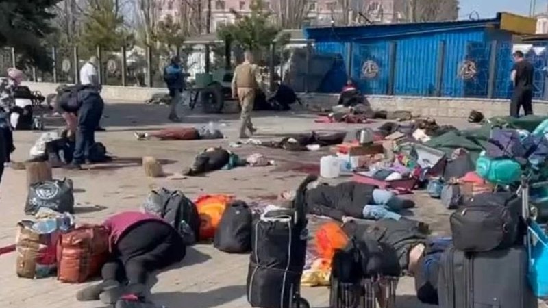 Bodies and pools of blood can be seen on the ground in photographs and videos posted on the railway's Telegram channel. Bags, clothes and soft toys are scattered around the station.