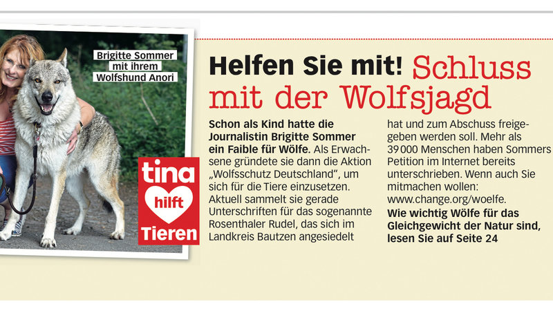 Die bundesweit erscheinende Frauenzeitung tina ist auch der Meinung, dass das Rosenthaler Rudel nicht abgeschossen werden darf. In ihrer neuesten Druckausgabe (gibts überall am Kiosk) ruft sie dazu auf, unsere Petition zu unterschreiben. Dazu wird im gleichen Text noch auf ein mehrseitiges Interview mit dem Förster und Bestsellerautor Peter Wohlleben hingewiesen. Das freut uns sehr.