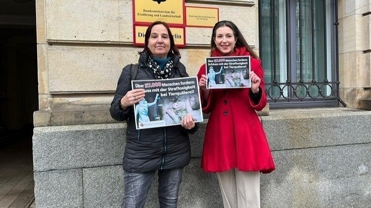 Vielleicht erinnern Sie sich, dass Sie die Petition "Schluss mit der Straflosigkeit bei Tierquälerei" unterschrieben haben? Vielen Dank dafür. Heute haben wir 57.308 Unterschriften an die Bundesminister Cem Özdemir und Marco Buschmann übergeben. Zusammen fordern wir, die Schwachstellen im Vollzugs- und Rechtssystem zu schließen, damit Tierquälerei endlich effektiv verfolgt und hart bestraft wird.