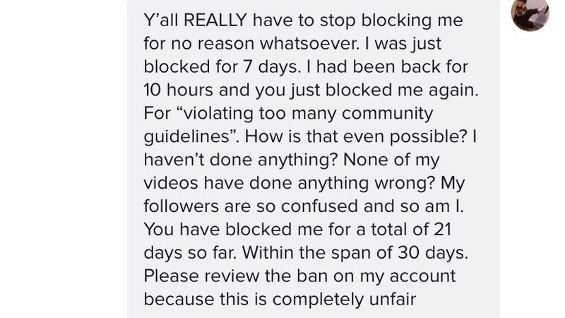 In summary, I was banned 3 separate times for 7 days respectively, within the last 30 days. That’s 21 out of 30 days that I’ve been blocked from posting. The first two times were because I posted videos about racism. They removed 6 of my videos for “violating community guidelines”, more specifically “hate speech”. They even removed a video where all I asked was “what would to do if straight people didn’t exist for 24 hours”. In just 3 hours, that video got 70k views and 5500 comments, tiktok then took it down for “hate speech” and shadowbanned the video when I tried to repost. I feel it was because the comments were filled with love and vulnerability from the LGBTQ+ community & TikTok didn’t like that.