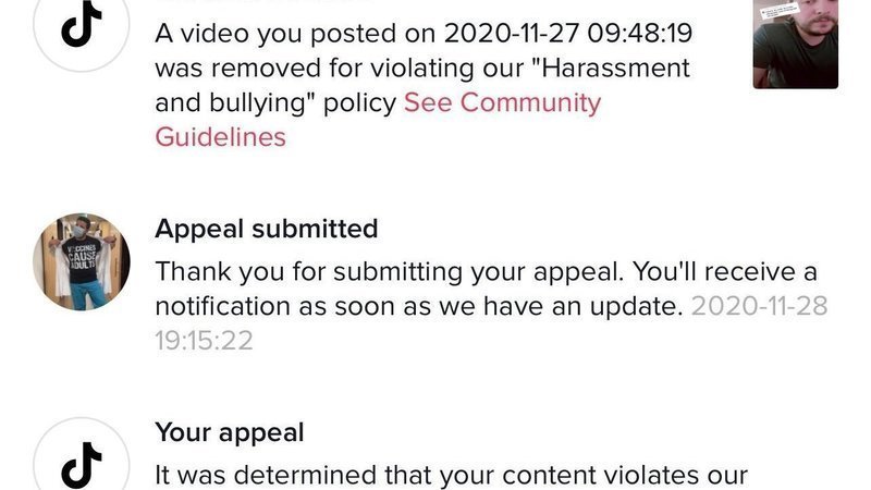 I started having videos removed after calling someone out who was claiming health departments were coercing physicians into changing death certificates. The next video that was removed was one where I called out ageism and survivorship bias. The third video came down when I responded to someone telling me "my kind will never reproduce". None of these videos violated any guidelines, and I bombarded TikTok on Twitter, via Feedback messaging and through email. I received ONE message saying my content would be looked at by the "Trust and Safety Committee" and several videos were restored the next day (no follow-up). Since then I've had videos muted calling out homophobia (although TikTok left the homphobic video up for days) and a recent video before it was even posted where I was calling out a creator spreading misinformation about COVID vaccines. Despite multiple messages again to TikTok, I have heard nothing.