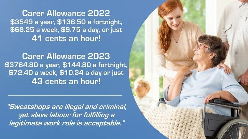 Until 31 December 2022 Carer Allowance was paid at the rate of $3549 a year, $136.50 a fortnight, $68.25 a week, $9.75 a day, or just 41 cents an hour to look after someone fulltime 24/4, 365 days a year.