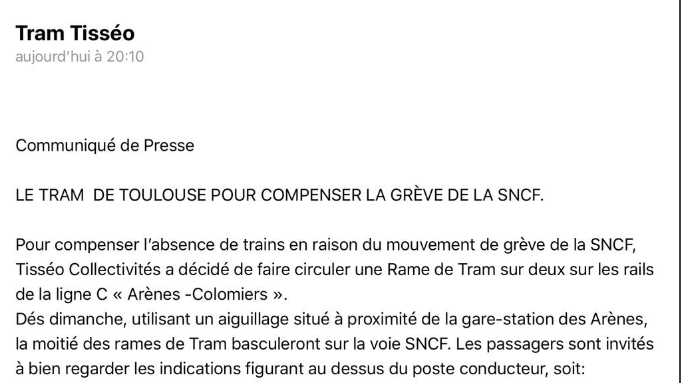 - l'adjoint au maire de Toulouse en charge des transports blague le 31 mars en soirée en annonçant que la ligne C sera assurée par des tramways affectés habituellement aux lignes T1 et T2. Un canular douteux pour les personnes grêvistes; une réalité dans certaines agglomérations comme Mulhouse où des "tram-trains" circulent