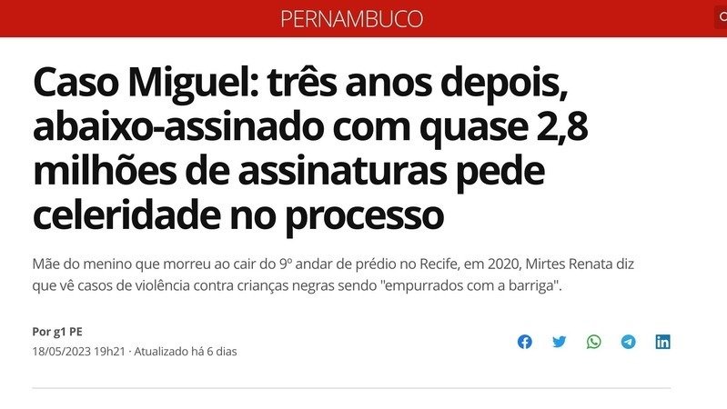 News alertJustiça por MiguelSaiu no G1! CasoMiguel: 3 anos depois, petição com 2,8 MI de assinaturas pede celeridade no processo