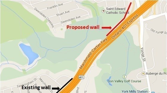 Urge the Ministry of Transportation to build a full sound barrier on Highway 401 North from Yonge St to Avenue Rd.
