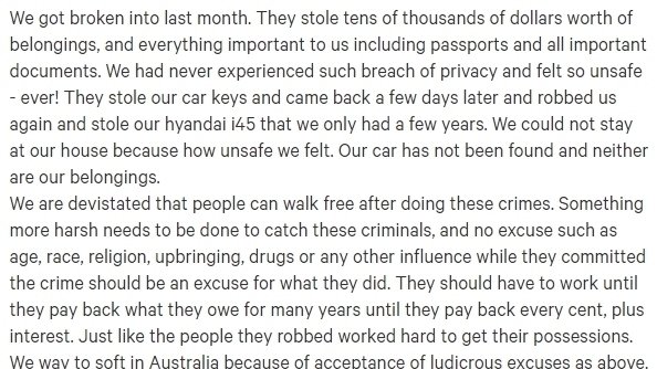 Petition updateTo enforce stricter laws for teenagers involved in crime.Thank you Australia for your support and we need more to show the importance of this issue